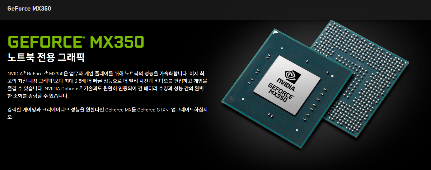 MX250과 MX350은 엔비디아에서 만든 그래픽카드이며 노트북 전용 그래픽카드라고 생각하시면 될 것 같습니다. 이러한 모델이 들어가는 이유는 내장 그래픽카드와 시중에 있는 그래픽카드의 사이를 메꾸기 위해 나왔다고 생각합니다.