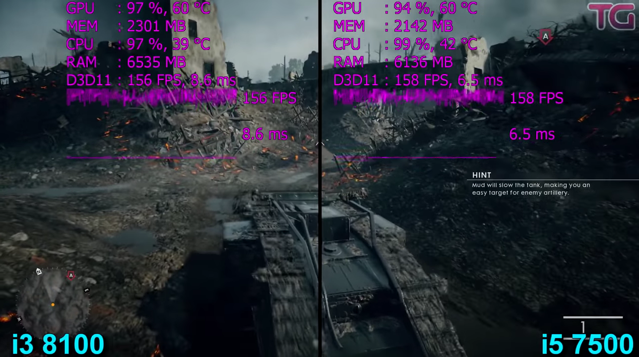 배틀필드 1에서 돌렸을 때 서로 왔다갔다 하면서 거의 동급의 성능을 보여주고 있습니다. UserBenchmark에서 보여준 2퍼 차이는 실제 게임에서는 큰 체감이 어렵다고 보이네요.