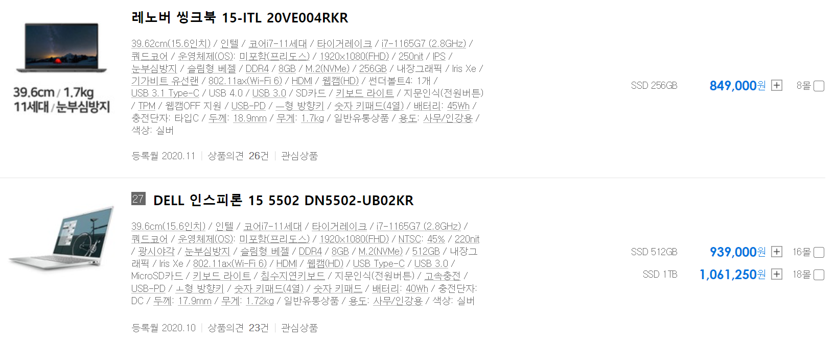 15.6인치 노트북 기준으로 인텔 i5-1135G7의 가격은 60만원 중반, 인텔 i7-1136G7의 가격은 80만원 중반으로 약 20만원 정도 차이가 나는 것을 알 수 있습니다.