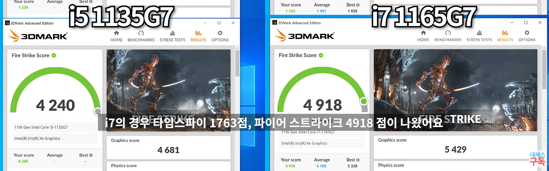 인텔 i5-1135G7의 그래픽 스코어는 4681점, 인텔 i7-1165G7의 그래픽 5429점으로 인텔 i7-1165G7이 15% 우세한 그래픽 성능을 보여주었습니다.