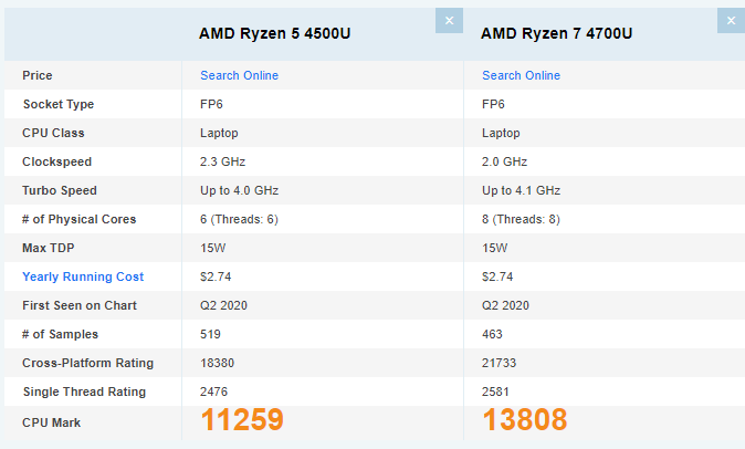 그렇다면 보급형 노트북에 사용되는 라이젠5 4500U, 라이젠7 4700U의 성능 차이는 얼마나 나게 될까요?