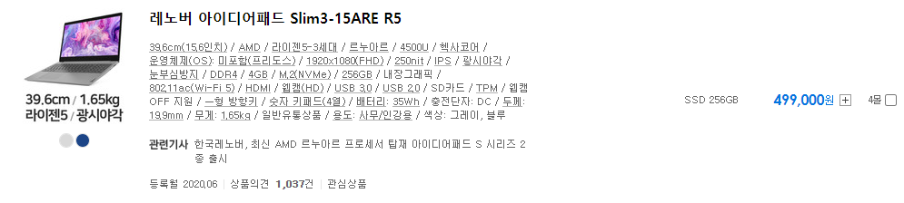 라이젠5 4500U의 비교적 높은 성능임에도 불구하고 위 모델 같은 경우에는 40만원 후반이기 때문에 가성비 노트북으로 선택할 때 좋은 선택지가 되었죠.