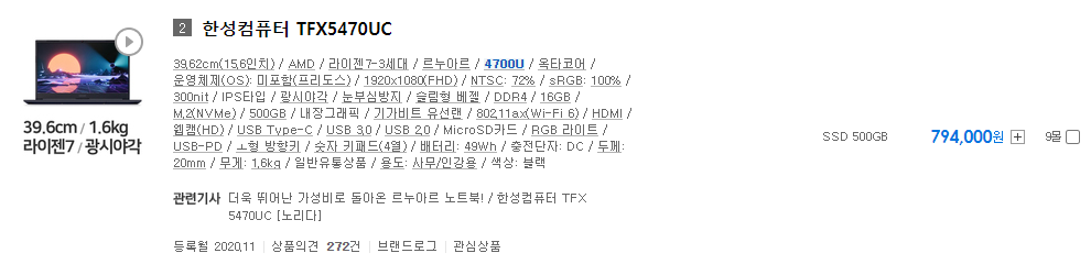 라이젠7 4700U가 탑재된 노트북들은 보통 70만원 후반에 시작되기 때문에 가격대가 어느 정도 있는 편입니다. 그러나 노트북을 한번 사게 되면 업그레이드가 불가능한 점이 있기 때문에 약간의 그래픽 성능 상승과 2코어가 추가된 8코어 CPU를 사용한다는 점에서 나쁘지 않은 선택이라고 할 수 있습니다.