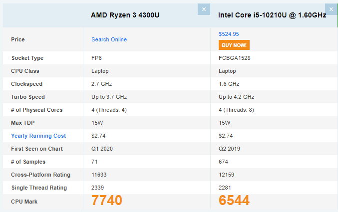 cpubenchmark.net에서 확인한 결과 인텔 i5-10210U가 라이젠3 4300U에 비해 밀리는 모습을 보여주고 있습니다. 그런데 이상한 점은 인텔 i5-10210U의 스펙이 훨씬 더 좋아 보이는데 인텔이 밀린다는 점입니다. 어떤 점 때문에 그런 것일까요?