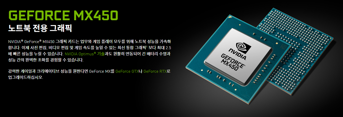 MX450의 특징으로는 PCIE 4.0을 지원하는 최초의 모바일 그래픽 카드이며 인텔 11세대 타이거레이크부터 PCIE 4.0을 지원하기 때문에 4.0의 성능을 확인하기 위해서는 타이커 레이크 제품 노트북에서만 확인이 가능합니다.