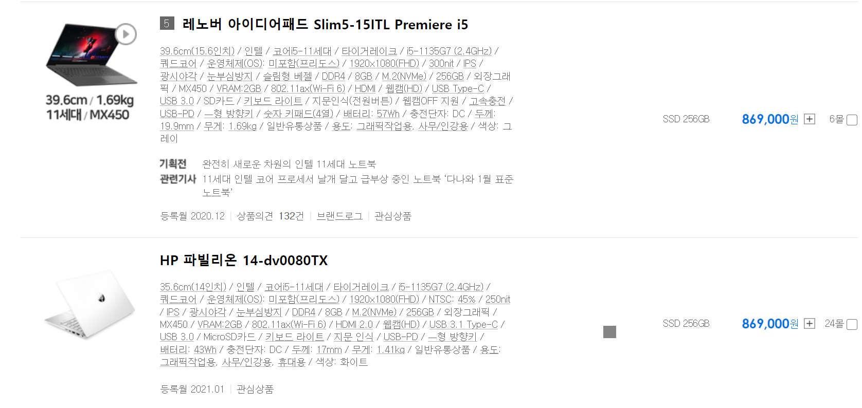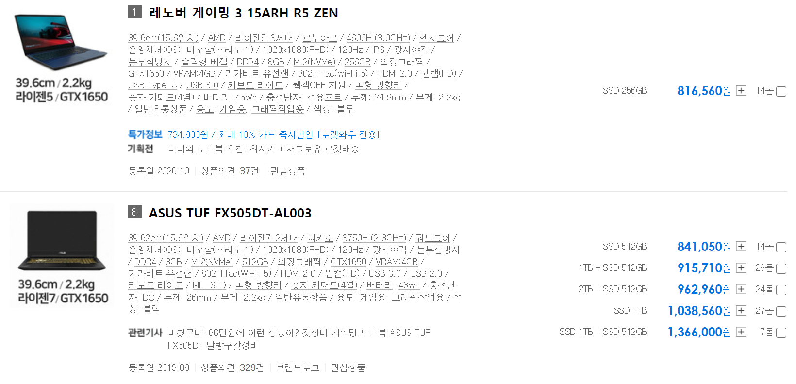 MX450 최저가는 약 87만원, GTX1650은 최저가가 약 82만원 정도 하기 때문에 만약 게임을 하시는 분들이라면 MX450을 선택할 이유는 없다고 봅니다. 가격 차이는 그렇게 나지 않는데 성능 차이는 2배 가까이 나기 때문이죠.