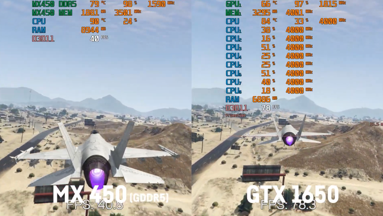 GTA 5의 프레임을 확인해 보시면 GTX1650의 성능이 MX450의 거의 2배 임을 알 수 있습니다. MX450도 많은 발전을 이뤄냈다고는 하나 아직 데스크톱에도 들어가는 그래픽카드를 이기지는 못하는 모습을 보여주네요.