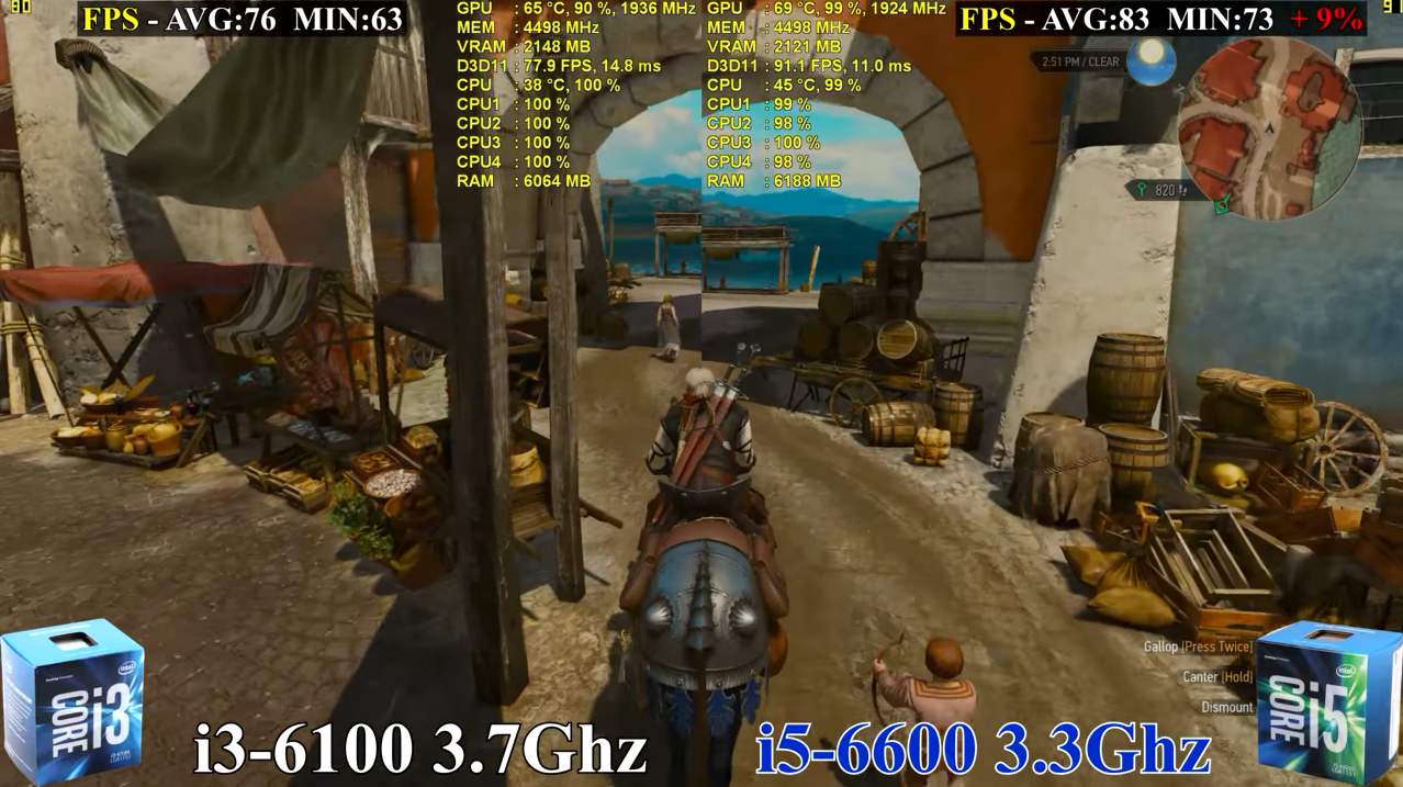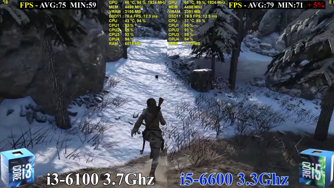 더 위쳐 3에서도 역시 i5 6600이 9% 성능 차이 우세를 보여주고 있습니다. 게임에 따라 다르겠지만 종합적으로 i5 6600이 i3 6100에 대비하여 10~15% 많게는 40% 정도 우세한 성능을 보여주네요.