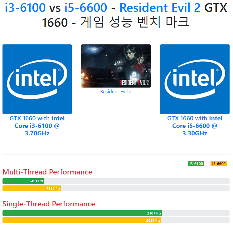 쓰레드 개수가 같더라도 물리 코어의 유무로 인하여 i5 6600이 더 우세한 성능을 보여주는 것을 확인하였습니다. 또한 GTA 5처럼 고사양 게임일수록 CPU 최적화가 더 진행되어 그 격차는 더욱 많이 나게 되네요.