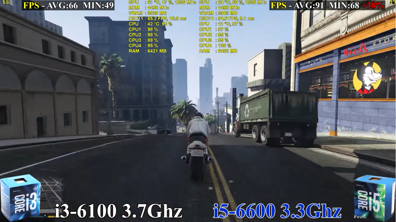GTA 5의 결과를 보시면 우측 상단에 i5 6600이 i3 6100에 대비하여 40% 이상 더 우세한 프레임을 보여주고 있습니다. 쓰레드의 개수는 같지만 물리 코어의 차이로 인하여 프레임 격차가 상당한 것을 확인할 수 있네요.