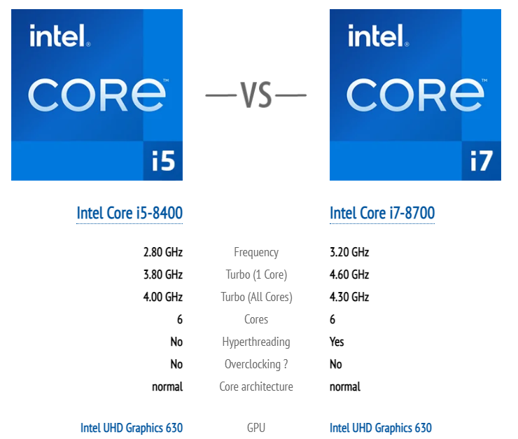 cpu-monkey 사이트에서 확인하면 올 코어 부스터에서 i7 8700이 0.3 GHz 더 우세한 것을 알 수 있습니다. 6쓰레드 차이와 클럭에서도 i7 8700이 우세하니 일단 i7 8700이 더 우세한 것으로 생각할 수 있겠네요.