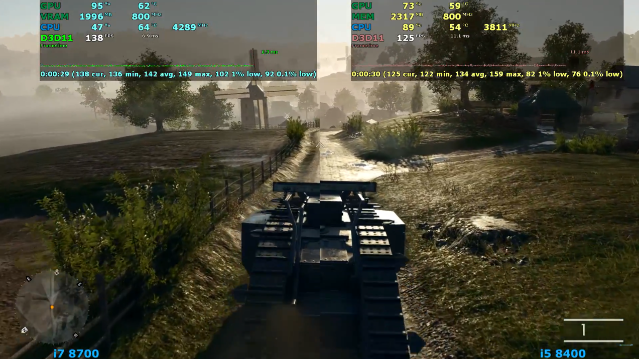 CPU를 잘 쓰는 게임으로 유명한 배틀필드 1을 보시면 i7 8700의 평균 프레임은 142, i5 8400의 평균 프레임은 134로 차이가 8 정도밖에 나지 않는 것을 확인할 수 있습니다.