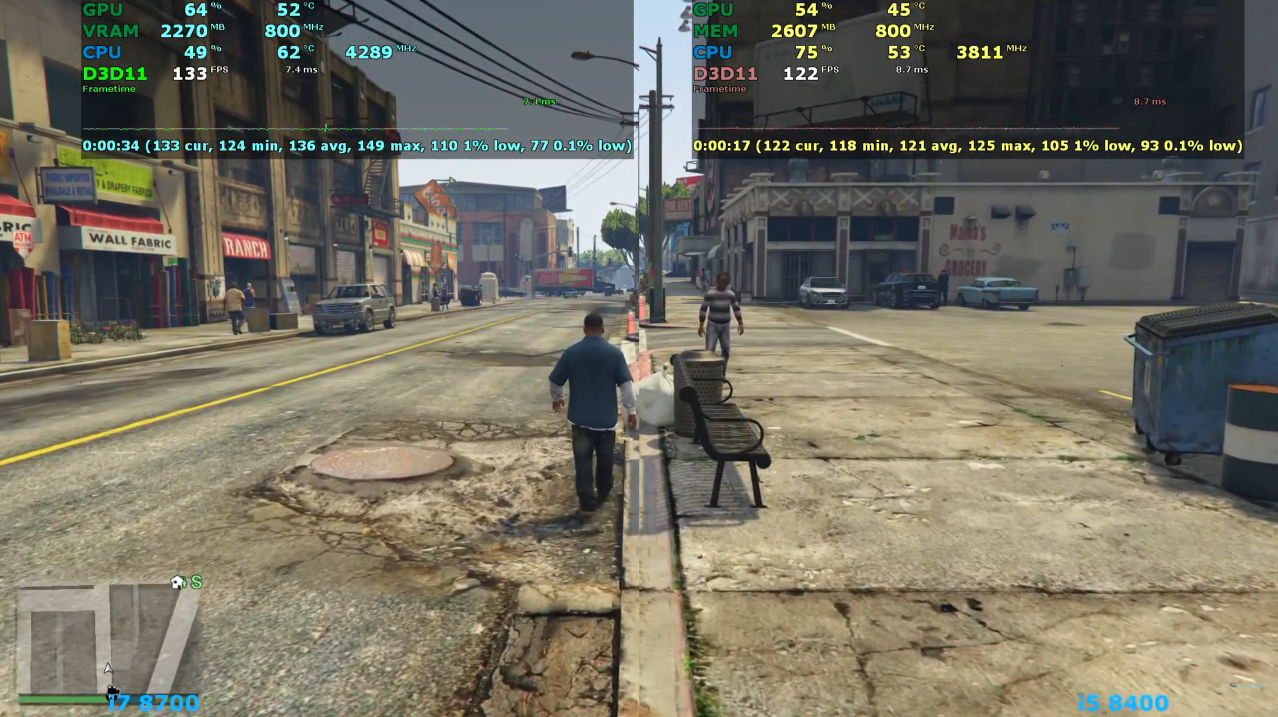 GTA 5를 보시면 i7 8700의 평균 프레임은 136, i5 8400의 평균 프레임은 121로 i7 8700이 12% 정도의 우세한 성능을 보여주었습니다. 또한 CPU 사용률에 있어서도 25% 차이가 나니 성능 차이가 있는 것이 확인이 되네요.
