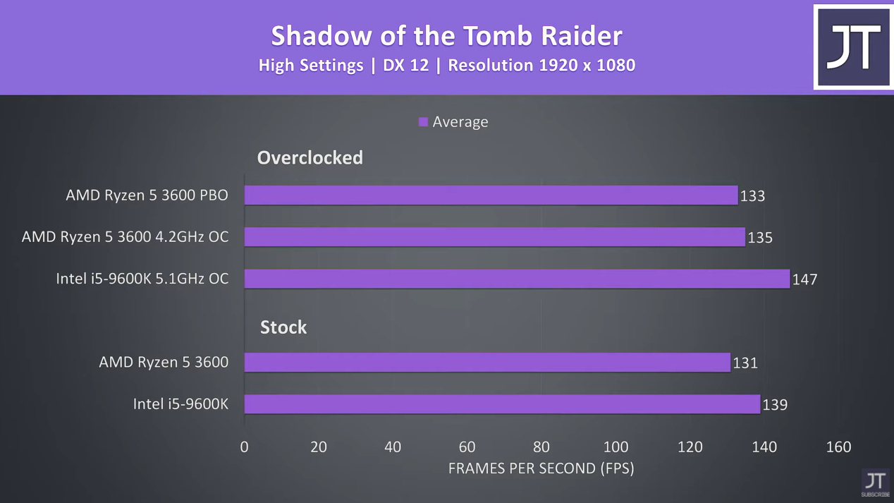 쉐도우 오브 더 툼레이더에서는 i5-9600K가 5% 정도 더 우세한 성능을 보여주었습니다. 라이젠 3600을 4.2Ghz까지 오버하여도 논 오버 i5-9600K를 이기지 못하는 모습을 보면 게임마다 서로의 성능이 엎취락 뒷 취락 하는 것 같습니다.