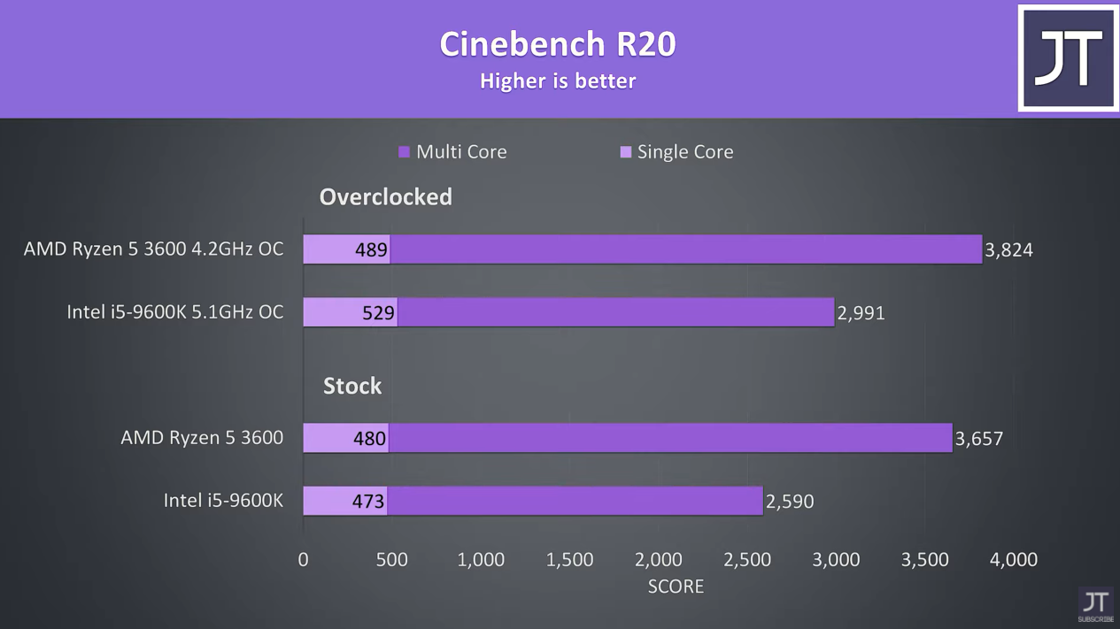 오버클럭 9600K(5.1Ghz)와 3600(4.2Ghz) 상태에서는 9600K의 싱글 코어 성능이 10% 이상 차이와 멀티 성능에서는 25% 까지 좁혀진 성능을 보여주고 있습니다.