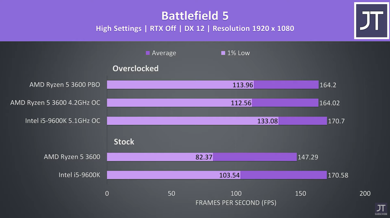 배틀필드 5에서는 아예 한 체급 이상 차이를 벌려주며 인텔 9600K가 20% 이상 우세한 성능을 보여주고 있네요. 이러한 점들을 종합적으로 보았을 때 인텔 9600K가 라이젠 3600에 비해 평균적으로 5~10% 정도 우세한 것을 확인할 수 있습니다.