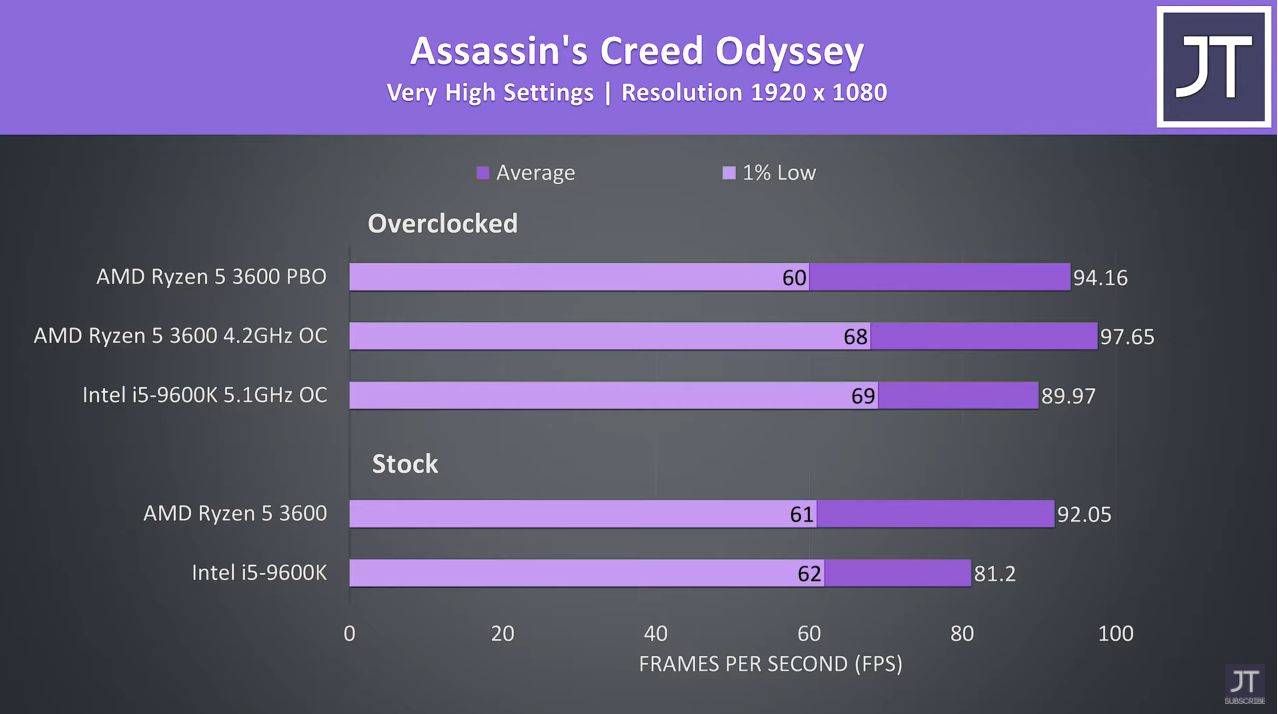 8코어까지 굴리는 어쌔신 크리드 오디세이를 확인하시면 논 오버 상태에서는 라이젠 3600이 i5 9600k보다 평균 프레임이 13%의 우세한 성능을 보여주었습니다. 9600K를 5.1Ghz 까지 오버해도 라이젠 3600의 논 오버의 평균 프레임은 이기지 못하네요.