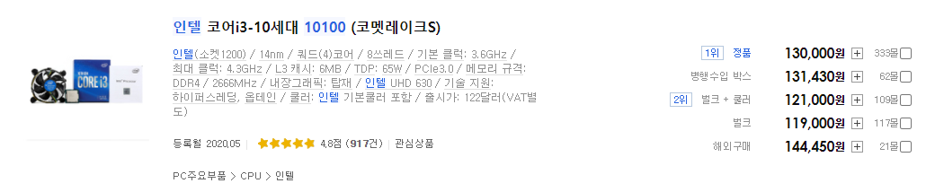 만약 여러분들이 새로운 CPU를 맞추신다고 하면 4코어 8쓰레드인 i3-10100도 있지만 저 CPU에서 내장그래픽만 제거한 i3-10100F는 10만원 정도에 가격이 형성되어 있으니 그 모델로 구성하시면 최강의 가성비 컴퓨터를 구성할 수 있다고 생각합니다.