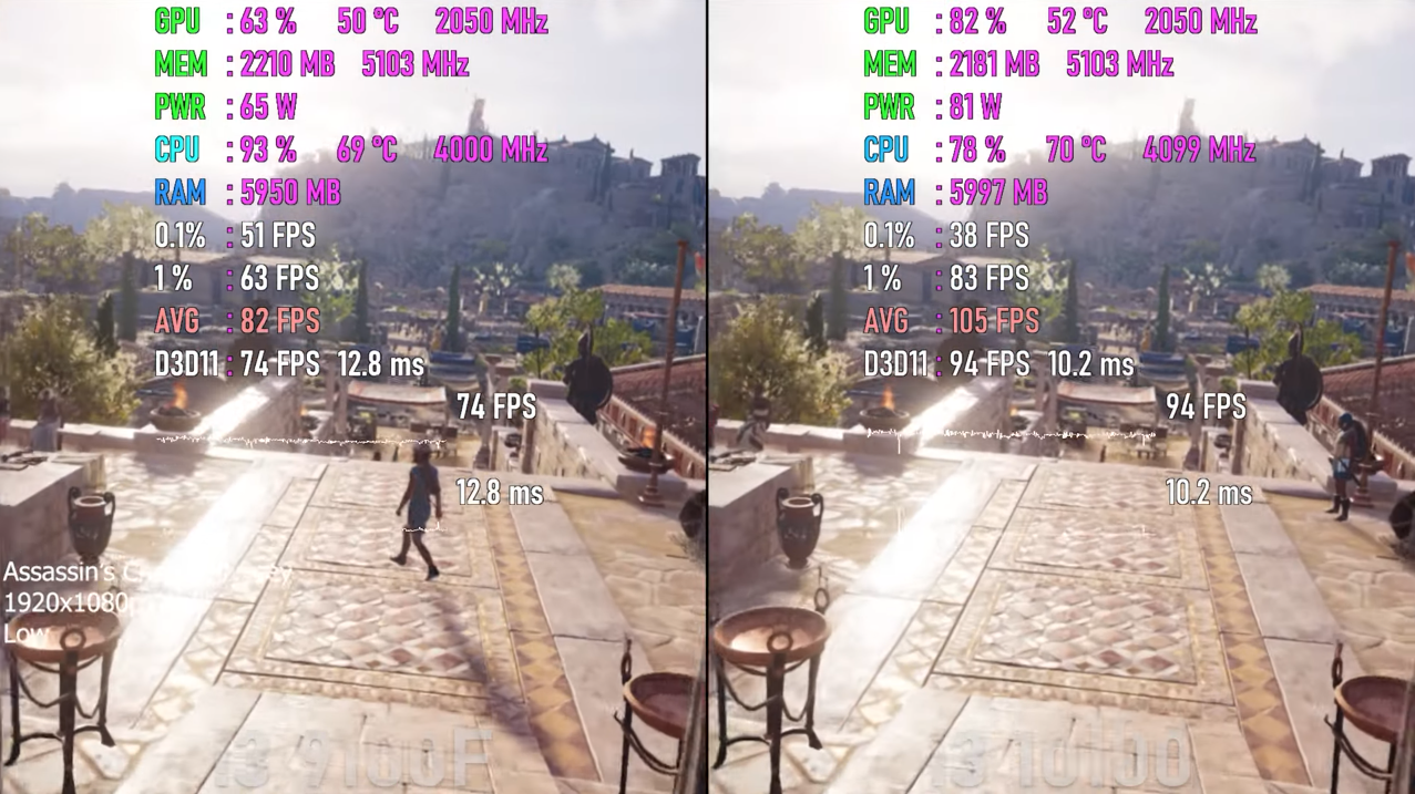어쌔신 오디세이 크리드에서는 i3-10100이 30% 이상 성능을 보여주었습니다. 종합적으로 보았을 때 i3-10100은 i3-9100F에 대비하여 20~30% 게임 성능을 보여주었습니다.