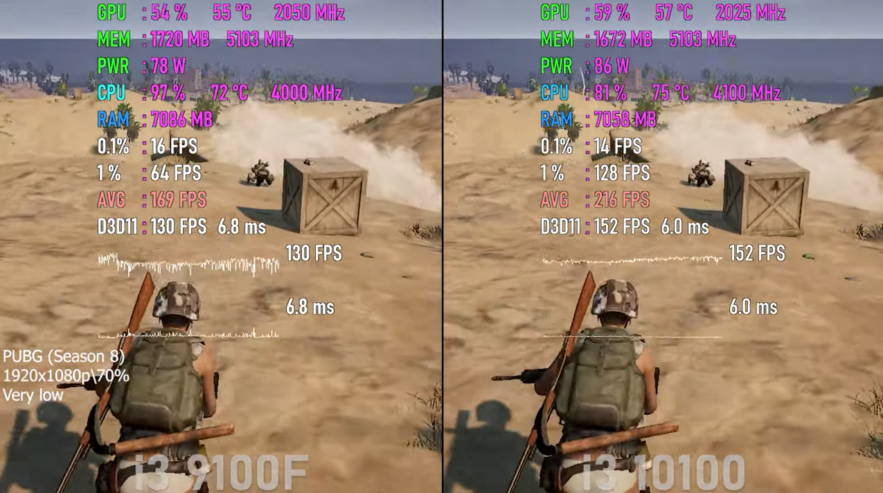 배틀그라운드에서는 아예 한 체급이 나는 CPU 차이를 보여주었습니다. i3 10100의 평균 프레임은 216, 9100F의 평균 프레임은 169로 30% 이상 차이를 보여주었습니다.