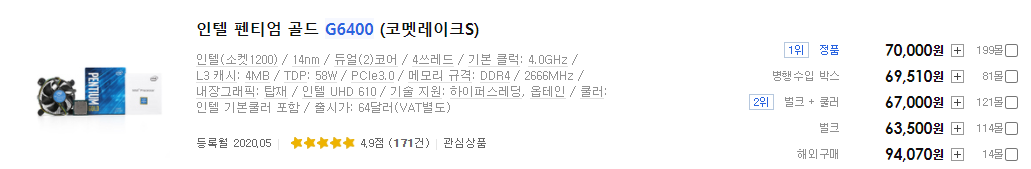 기본 클럭이 4.0Ghz 수준으로 많이 올라간 것을 볼 수 있으며 그에 따라 TDP가 58W로 전 세대 팬티엄보다 약간 증가한 것을 알 수 있습니다. 가격은 7만원대로 형성이 되어 있네요. 과연 팬티엄 G6400으로도 최신 게임들이 돌려질까요?