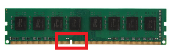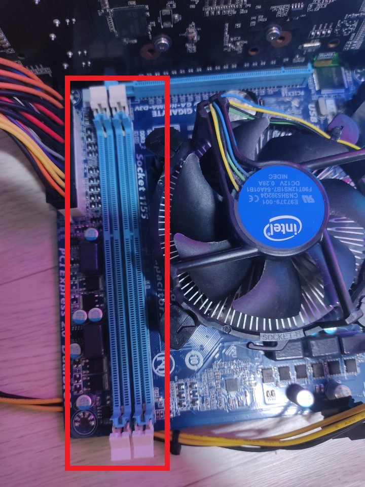 빨간색 부분을 보시면 가운데에 홈이 있는 것을 확인하실 수 있습니다. DDR3의 가운데에 뚤려있는 그 홈에 맞게 꼭 넣어주셔야 들어가니 잘 보시고 넣으시면 됩니다. 꼭 명심하셔야 할 것은 필요 이상으로 PC에 힘을 주는 느낌을 받으면 그 방법은 잘못된 방법일 확률이 높으니 다시 한번 확인해주시길 바랍니다.