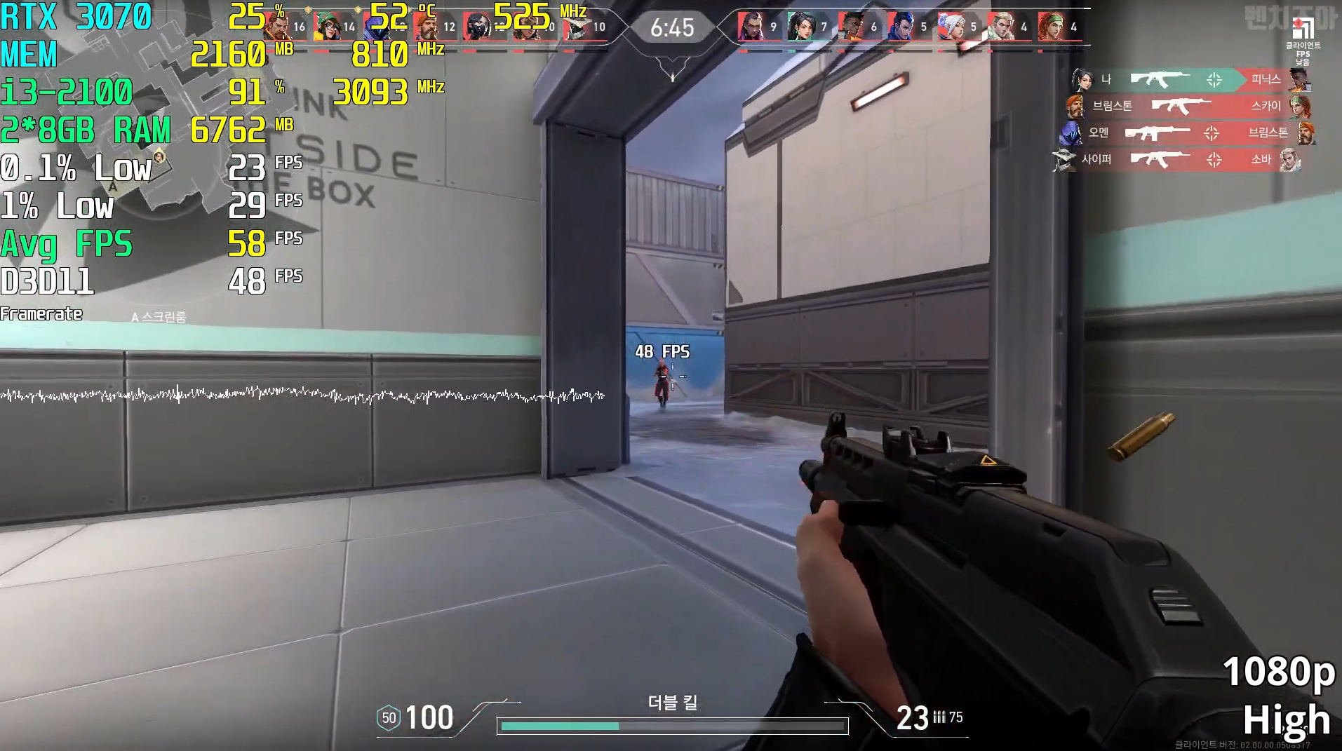 발로란트를 확인해보시면 교전을 할 때마다 프레임이 50이하로 넘어가서 끊김이 자주 체감되는 것을 확인할 수 있습니다. 발로란트도 나름 저사양 게임인데 i3 2100이 버텨주지 못하는 것이 의외네요.