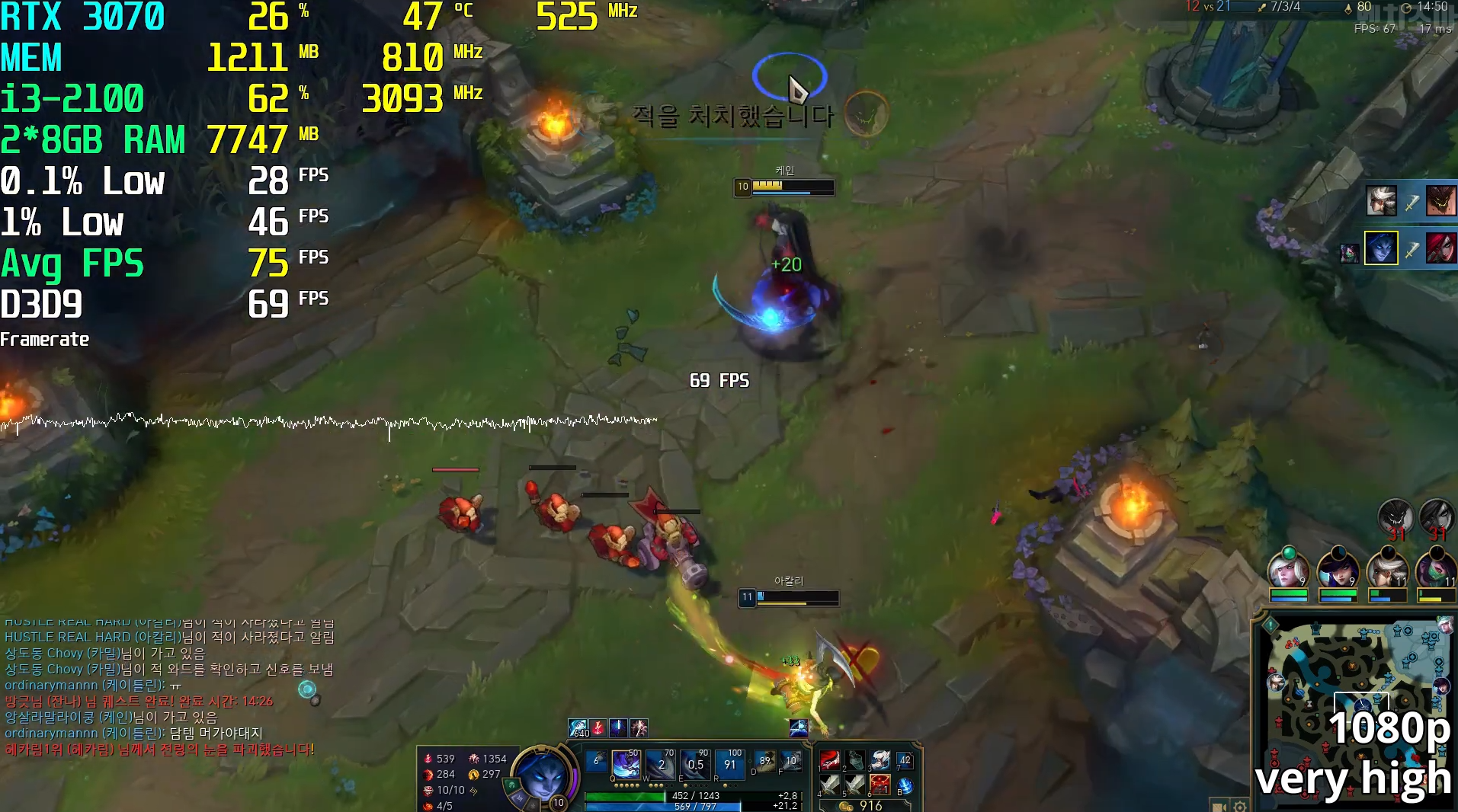 오버워치 중옵으로 돌렸을 때 평균 프레임을 보시면 67로, 충분히 즐길 수 있는 CPU라고 보입니다! 다만 빡겜을 하기에는 50으로 내려갈 때가 있어서 적당히 즐기기에 좋은 CPU라고 생각됩니다.