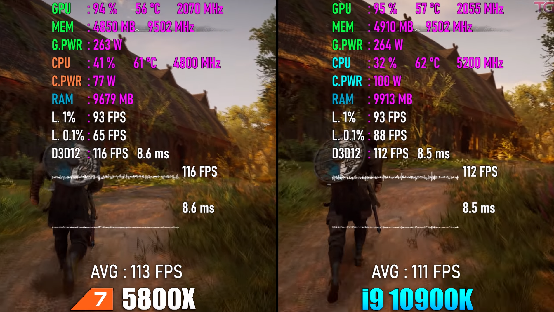 어쌔신 크리드 발할라에서 진행한 프레임 역시 서로 비슷하게 보여주며 차이가 거의 없다시피 하네요. 단, 인텔에게는 라이젠보다 2코어 더 여유가 있기 때문에 CPU 사용률에서 인텔이 10% 정도 더 여유로운 모습을 보여주고 있습니다.