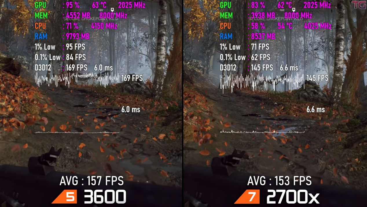 배틀필드 5는 8코어까지 쓰는 게임이기 때문에 라이젠 2700X가 더 프레임이 잘 나올 것이라고 생각했지만 막상 뚜껑을 열어보니 2코어가 부족한 라이젠 3600에 밀리는 모습을 보여주고 있네요.