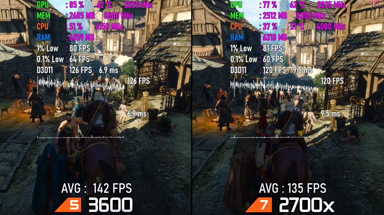 더 위쳐 3에서도 역시 라이젠 3600이 5% 정도 우세한 평균 프레임을 보여주면서 라이젠 3600이 라이젠 2700X에 비해 게임 성능이 더 우세한 것을 보여주었습니다.