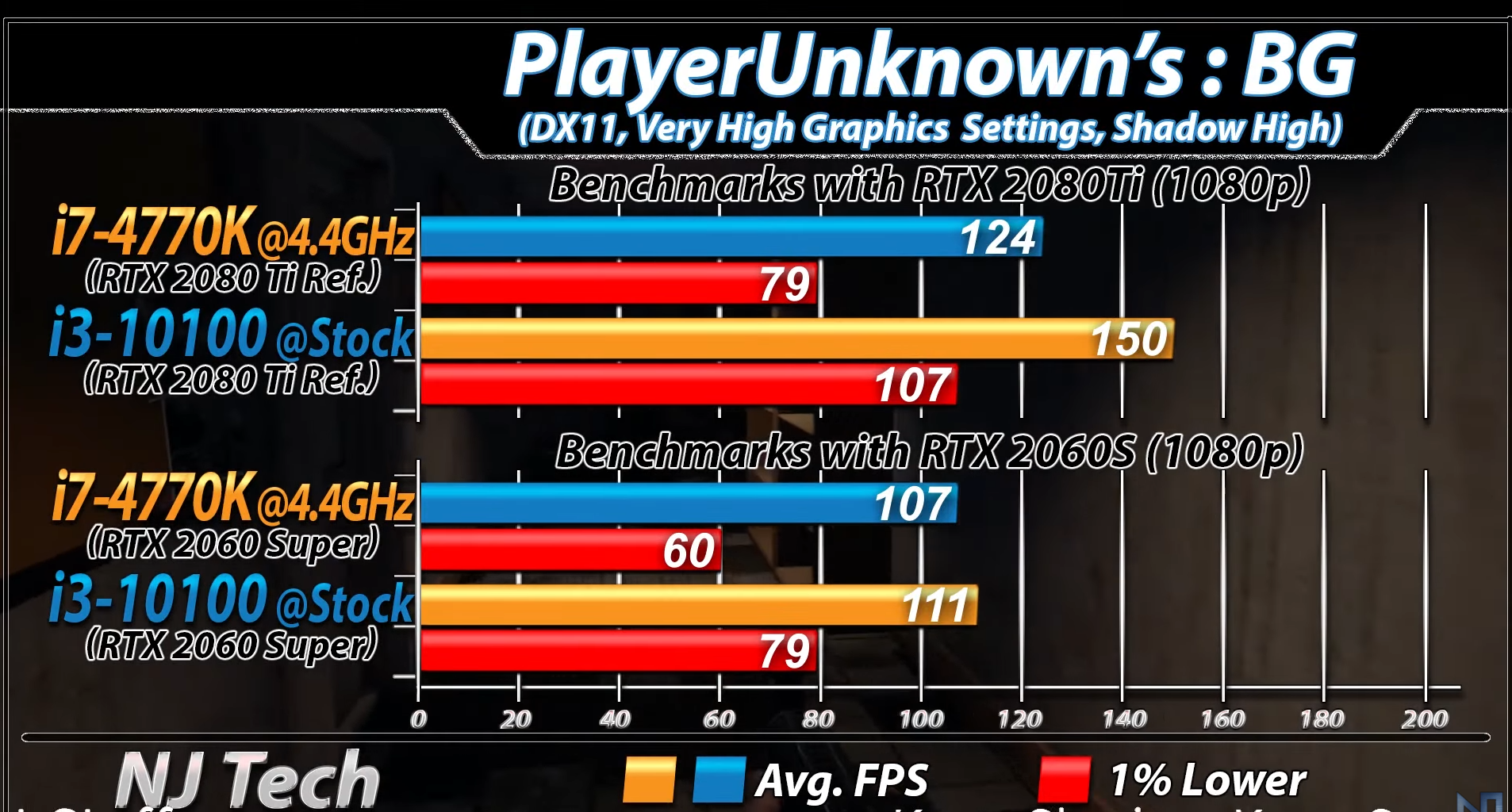최적화가 잘 안 나있기로 소문난 배틀그라운드 역시 i3-10100이 15% 정도 우세한 성능을 보여주면서 i7-4770K를 크게 이기는 모습을 보여주었습니다.