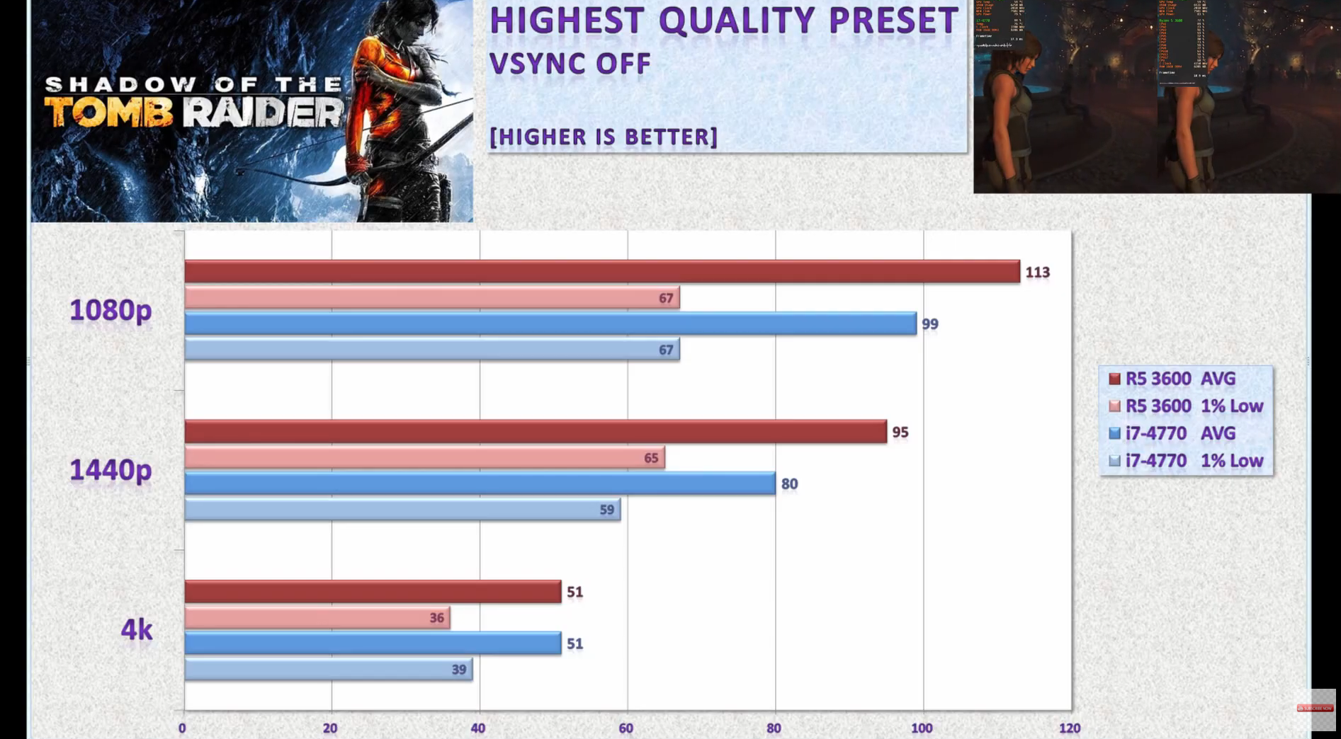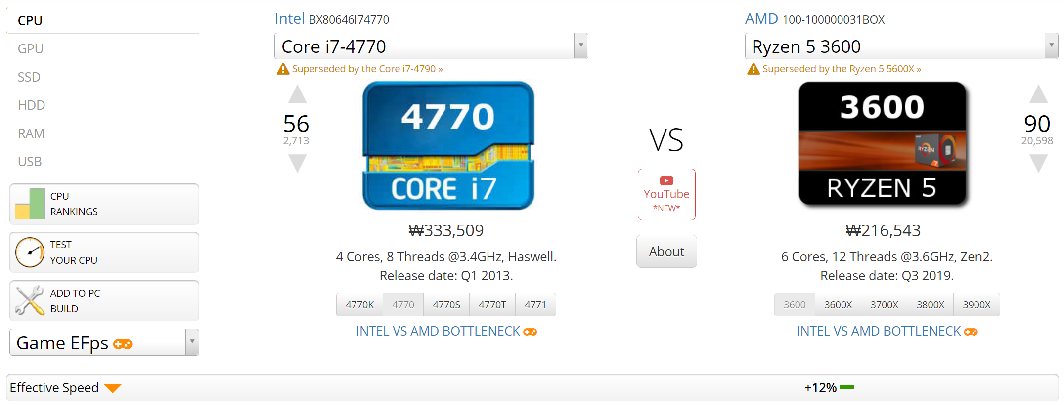 Userbenchmark에서 시행한 결과를 보시면 라이젠 3600이 i7-4770에 비해 12% 정도 우세하다고 나와있습니다. 그렇다면 실제 게임에서도 저 정도의 차이가 나게 되는 걸까요?