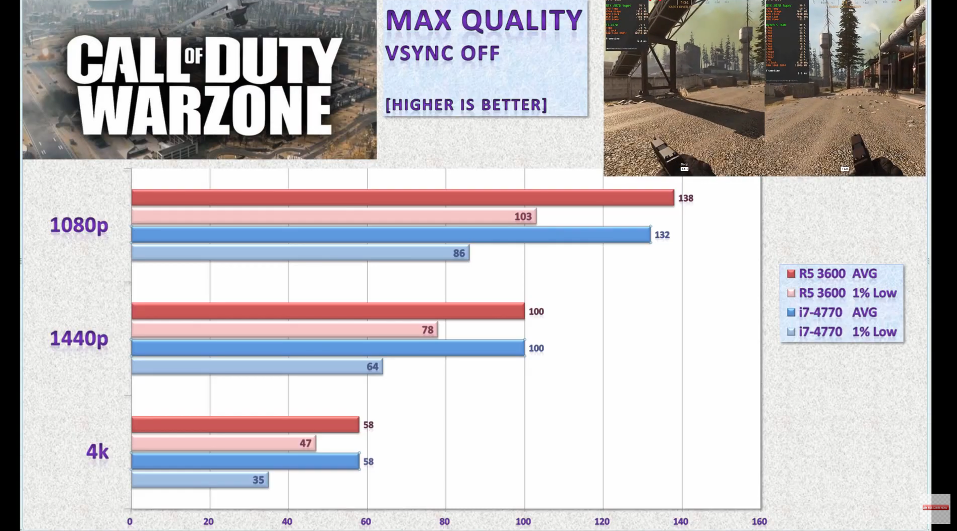 콜 오브 듀티 워존에서는 격차가 많이 줄어들어서 라이젠 3600이 5% 정도 우세한 성능을 보여주네요. 인상적인 것은 8년이 지난 인텔 i7-4770이지만 아직까지 여러 게임들에서 60hz 기준으로 보았을 때 충분히 성능을 내줄 수 있는 CPU라는 것입니다.
