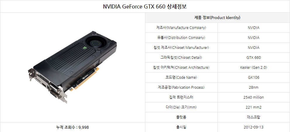 hwbattle에서 보시면 2012년 9월에 출시한 그래픽카드임을 알 수 있으며 코드명은 케플러라고 나와있네요. 현재 기준으로 출시한 지 9년 정도 된 그래픽카드인데 어디까지 힘을 낼 수 있을 지 차근차근 살펴보겠습니다.