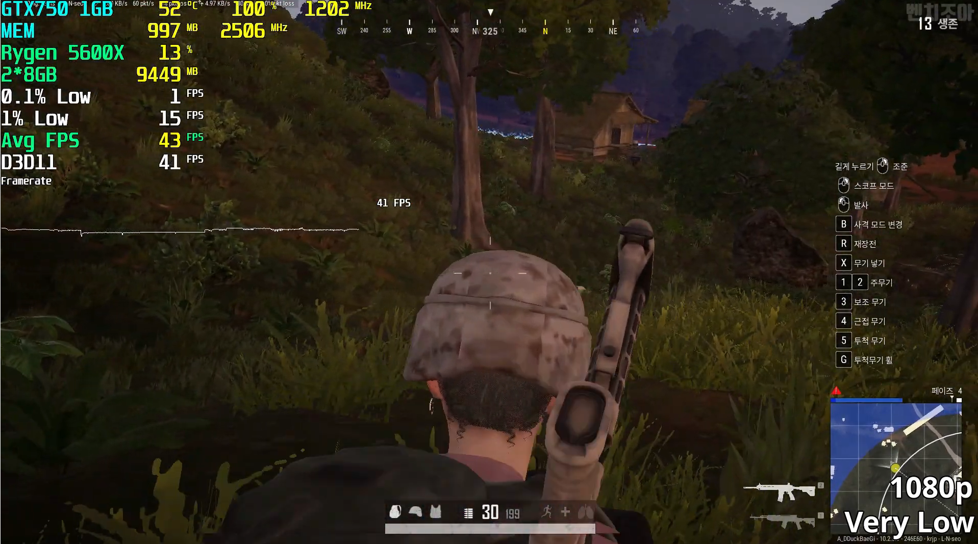 배틀그라운드 매우 낮음에서 돌릴 시 평균 프레임 43 정도를 보여주며 원활한 게임 진행은 어려울 것으로 보입니다. 오버워치까지 잘 돌려준 GTX750이었지만 배틀그라운드에서는 많이 부족한 모습을 보여주었네요.