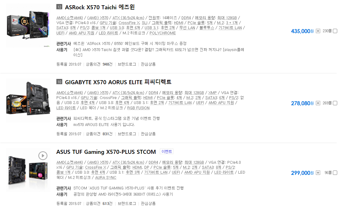 상위 제품들 중 위 세 개의 제품들 중 하나를 가시면 될 것 같습니다. 확실히 X570으로 가니 가격대가 올라가서 30만원 이상 하는 것으로 보이네요.