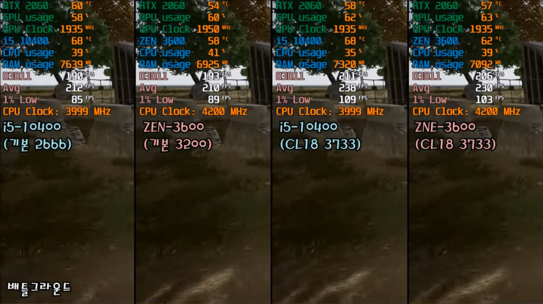 극 오버를 당겼을 때도 성능이 거의 비슷한 것을 확인하실 수 있습니다! 한편, 배그에서 램 오버클럭의 힘은 대단하네요. 인텔 10400 쪽을 보시면 2666에서 3733까지 올렸는데 평균 프레임이 20이나 상승했습니다. 역시 배그에서 램 오버클럭은 필수적으로 보이네요.
