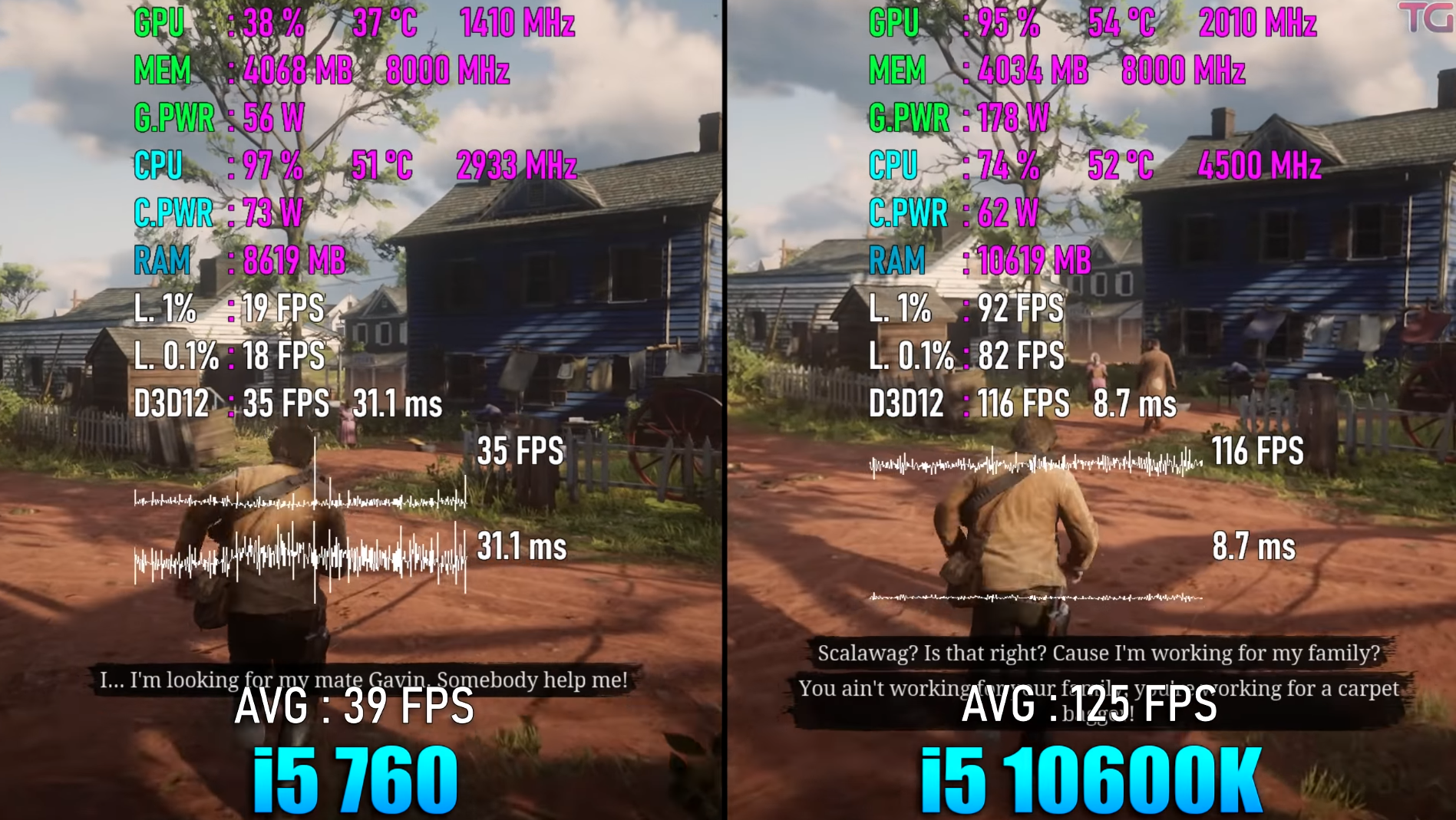 어쌔신 크리드 오디세이에서도 마찬가지로 i5 760이 크게 힘들어하는 모습을 보여주면서 원활한 진행은 힘들어 보이네요. 그에 반면 i5-10600K는 760보다 높은 클럭과 코어와 쓰레드 개수를 가지고 있어서 GPU의 성능까지 잘 뽑아주는 모습을 보여주고 있습니다.