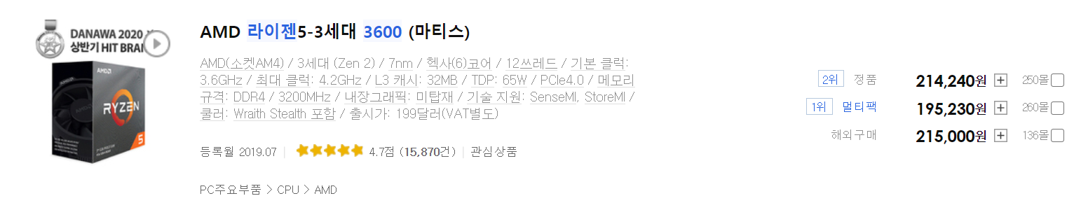 | 인텔 i3-10100 | 라이젠 3600 | |