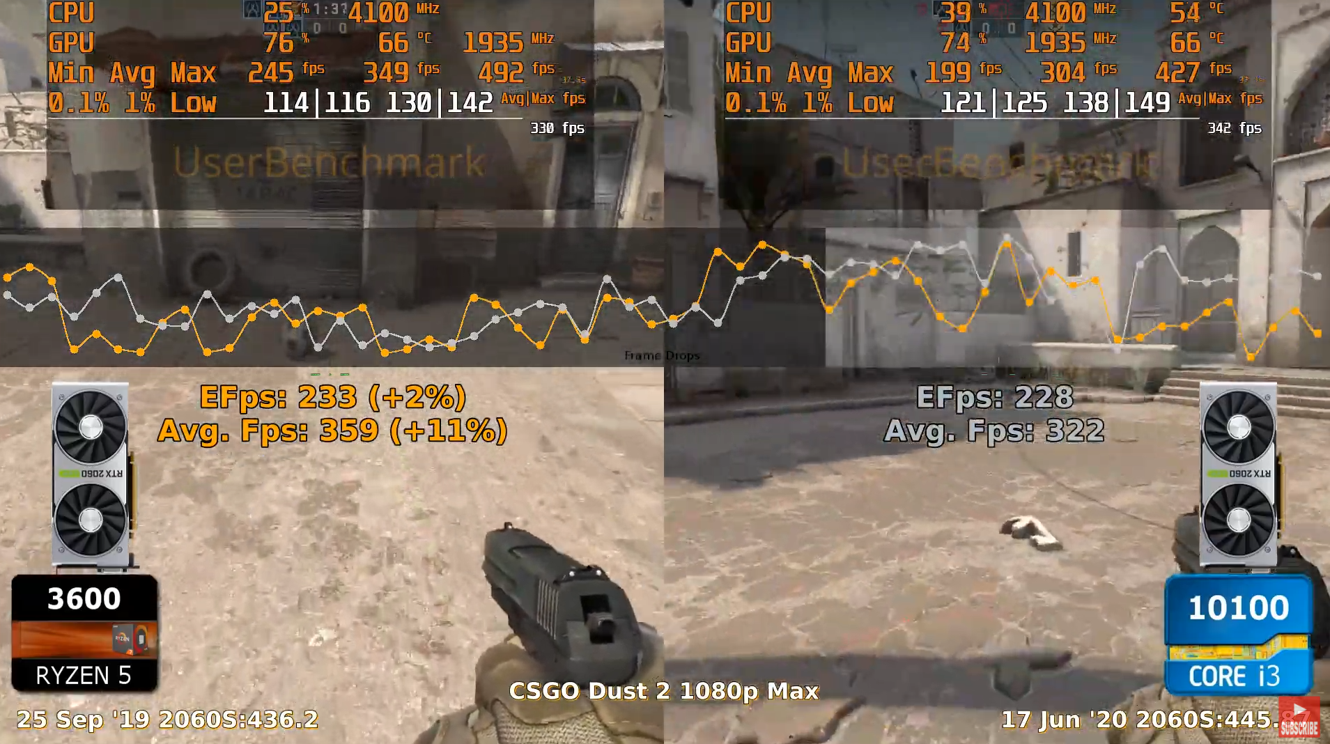 저사양 게임인 CSGO에서 비교한 결과 라이젠 3600의 평균 프레임이 359, i3-10100의 평균 프레임은 322로 라이젠 3600이 10% 더 우세한 성능을 보여주고 있습니다.