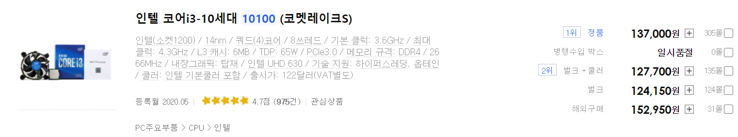 i3-10100의 장점이라면 코어와 쓰레드 수는 밀려도 같은 올코어 부스트를 가지고 있다는 점과 6만원 더 값싼 가격이라고 할 수 있겠네요.