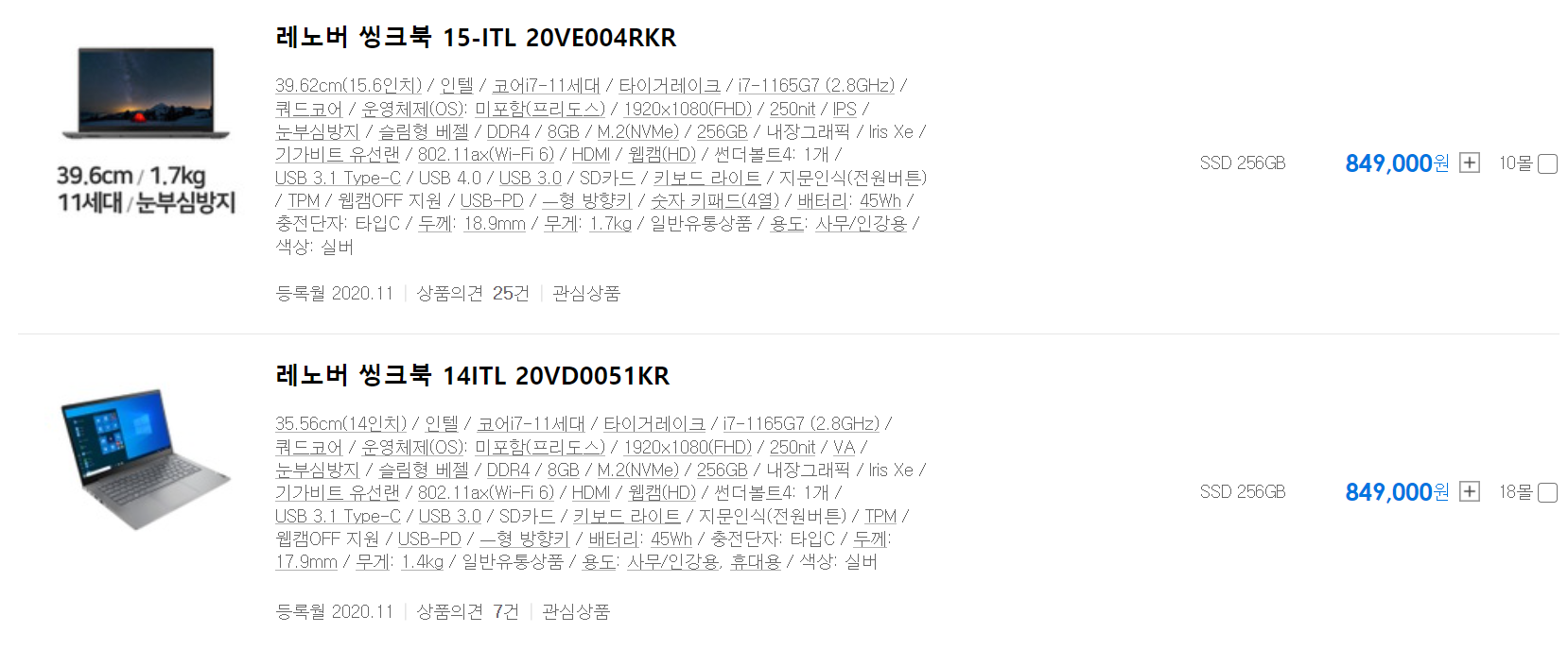 그렇다면 가격적인 면에서는 어떤 모델이 더 우세할까요? 다나와 최저가에 있는 노트북이 어떤 모델들이 있는지 살펴보았습니다.