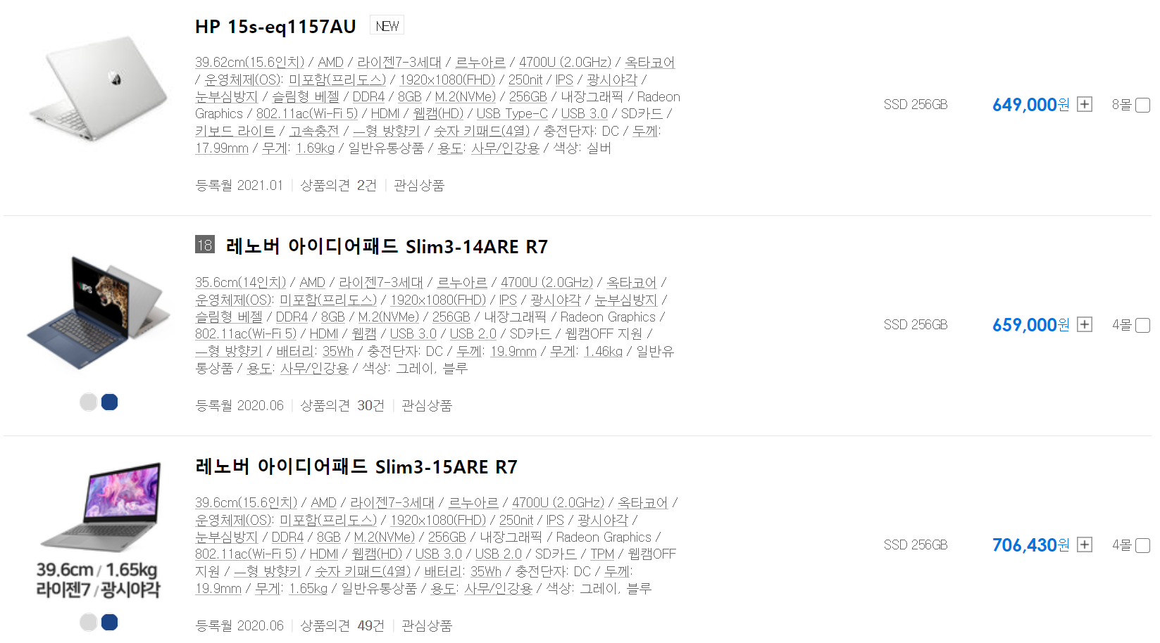 인텔 노트북의 최저가는 85만원인 반면 라이젠의 최저가는 65만원으로 나와있습니다. 그래픽 성능이나 CPU 성능에서도 밀리는 모습을 보여주고 있는데 가격적인 면에서 라이젠에게 더 유리하다는 점이죠.