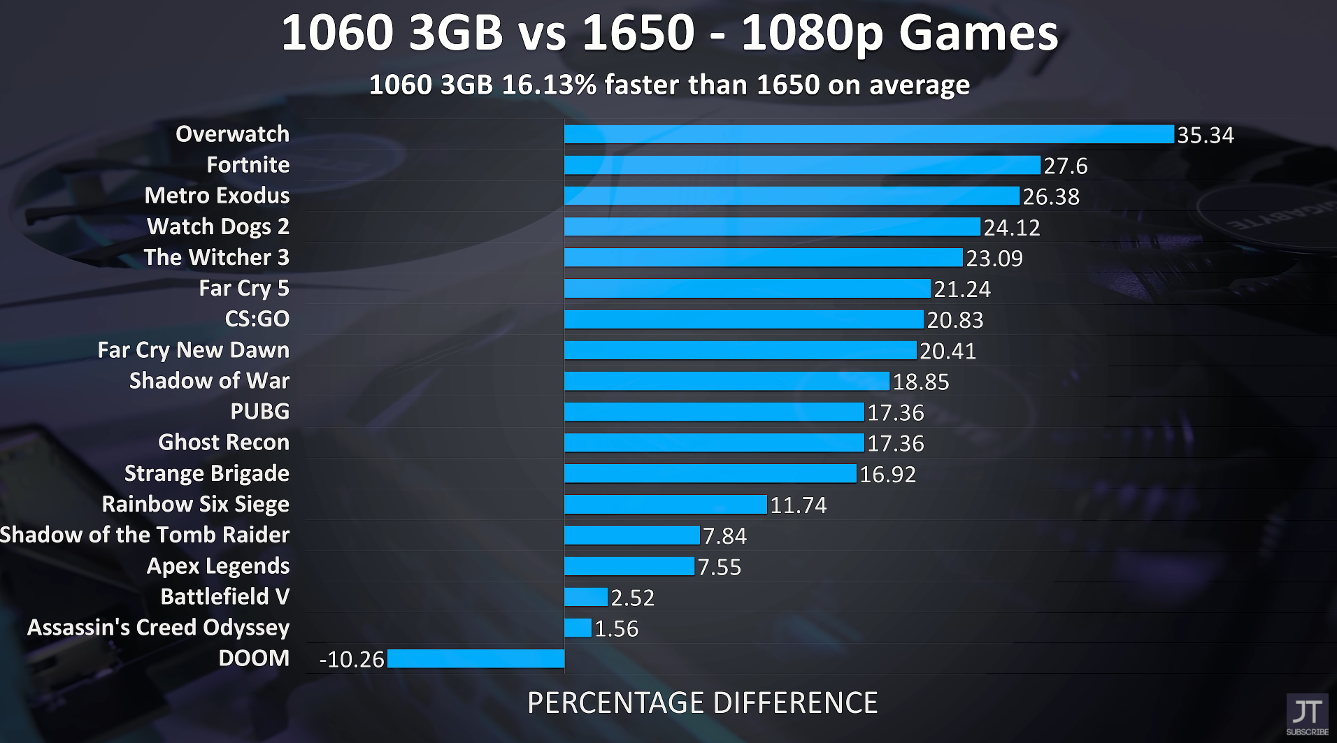 종합적인 결과를 보았을 때 GTX1060 3GB가 GTX1650에 비하여 약 16% 우세한 결과를 보여주었습니다. DOOM같이 GTX1650이 더 유리한 게임도 있지만 대체적으로는 GTX 1060 3GB가 더 우세한 모습을 보여주었네요.