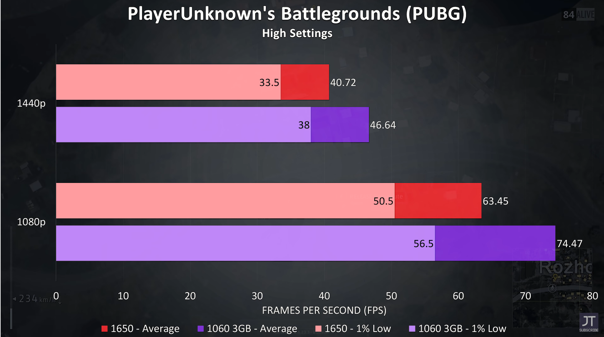 배틀그라운드 높음에서는 GTX1060 3GB가 약 20% 더 우세한 프레임을 보여주었습니다. 국내에서 FPS로 인기 있는 게임들로 GTX1650정도면 FHD기준으로 무난히 플레이가 가능해 보이네요.