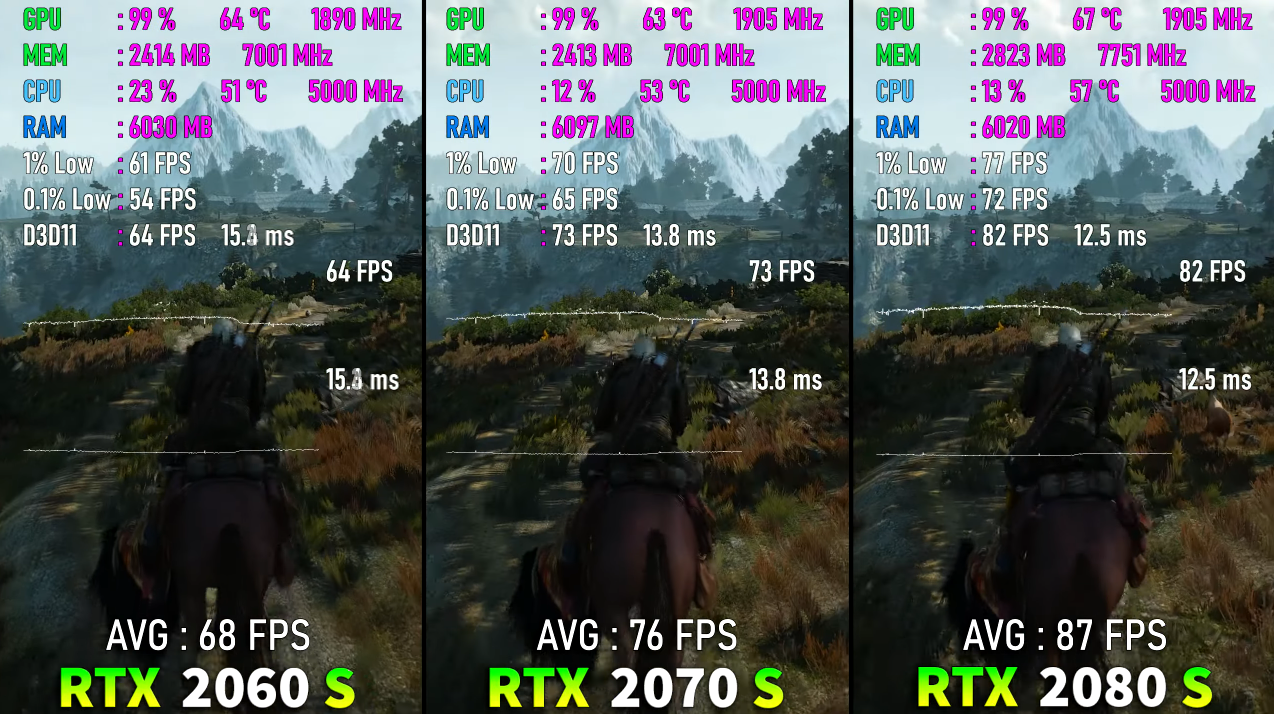 QHD 더 위쳐 3 매우 높음에서 돌렸을 때 평균 프레임은 각각 68, 76, 87로 2070 Super는 2060 Super에 대비하여 약 15%, RTX 2080 Super는 GTX 2070 Super 대비 약 15% 우세한 성능을 보여주었습니다.