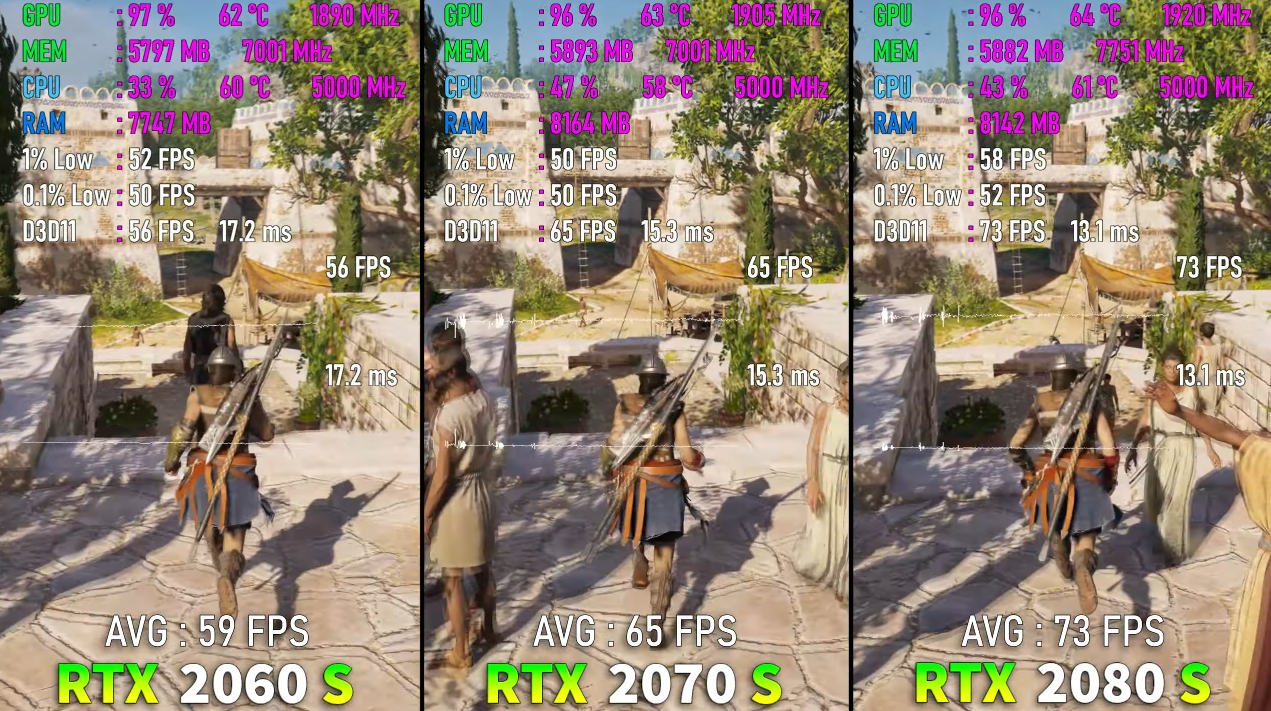 QHD 어쌔신 크리드 오디세이 울트라에서 돌렸을 때 평균 프레임은 각각 59, 65, 73로 2070 Super는 2060 Super에 대비하여 약 10%, RTX 2080 Super는 GTX 2070 Super 대비 약 10% 우세한 성능을 보여주었습니다.