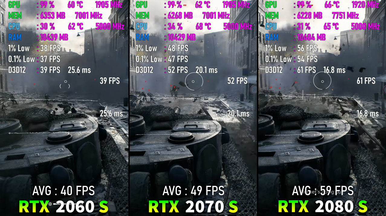 QHD 배틀필드 5 울트라에서 돌렸을 때 평균 프레임은 각각 40, 49, 59으로 2070 Super는 2060 Super에 대비하여 약 20%, RTX 2080 Super는 GTX 2070 Super 대비 약 20% 우세한 성능을 보여주었습니다.