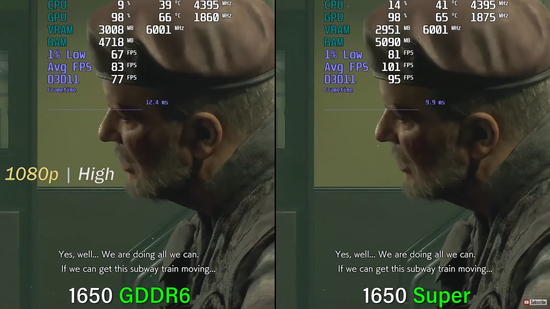 레지던트 이블 3 높음에서 각 평균 프레임은 83, 101로 GTX 1650 Super가 GTX 1650 대비 약 20% 이상 우세한 성능을 보여주었습니다. $10만 증가하였을 뿐인데 성능이 20% 이상 증가한 것이면 가성비가 엄청 좋아졌네요??